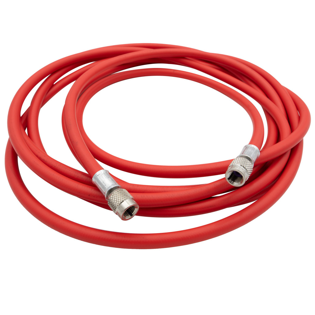 Rugalmas piros gumi tömlő klímatöltéshez, 1/4 SAE csatlakozókkal, 6 méter hosszú.
