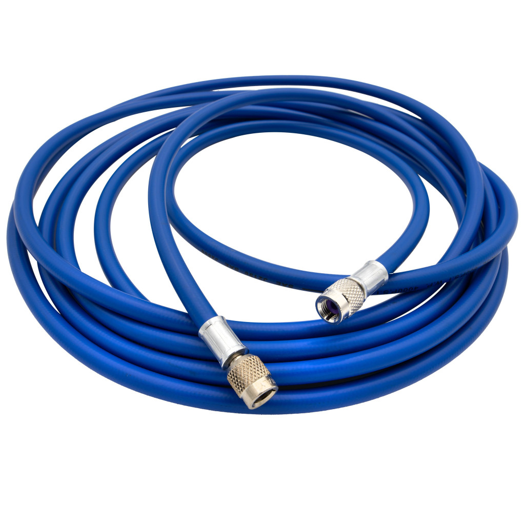 Rugalmas kék gumi tömlő klímatöltéshez, 1/4 SAE csatlakozókkal, 6 méter hosszú.