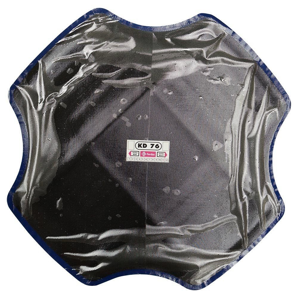 Gumijavító folt diagonális gumiabroncsokhoz KD 76, futófelület javításához. Hideg és 155°C-ig meleg vulkanizáláshoz. Méret: 345x345mm.