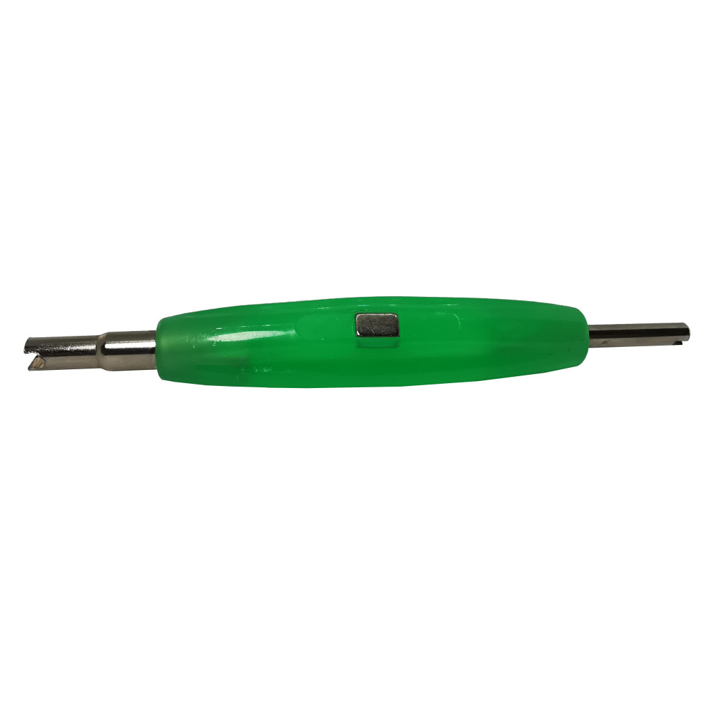 Kétvégű csavarhúzó standard VG5 és nagy VG8 szeleptűkhöz mágnessel a markolatban. Lehetővé teszi, hogy a csavarhúzót bármilyen fém alkatrészhez vagy felülethez rögzítse. Kényelmes, hiszen a kihúzót mindig a közelben tarthatja, pl.: azon a felnin, amelyen éppen dolgozik. A csavarhúzó a rugós szeleptűk becsavarására és eltávolítására szolgál a gumiabroncsok szelepeiben. Hasznos szerszám a motorkerékpárokat, személygépkocsikat, furgonokat, teherautókat, építőipari és mezőgazdasági járműveket javító műhelyek számára. A kihúzónak két hegye van (VG5, VG8). A markolat zöld kompozit anyagból készült.
