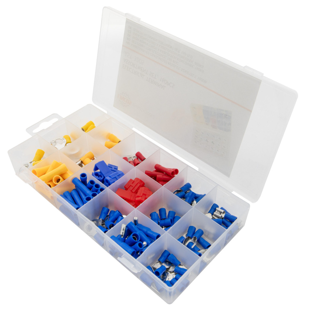 Ez a 160 darabos elektromos sarukészlet tökéletes megbízható és tartós vezetékkapcsolatokhoz autóipari, ipari és háztartási alkalmazásokban. A készlet tartalmaz gyűrűs, villás, toldó, apa és anya gyorscsatlakozókat, amelyek széles vezetékátmérő tartományt fednek le (22-10 AWG).