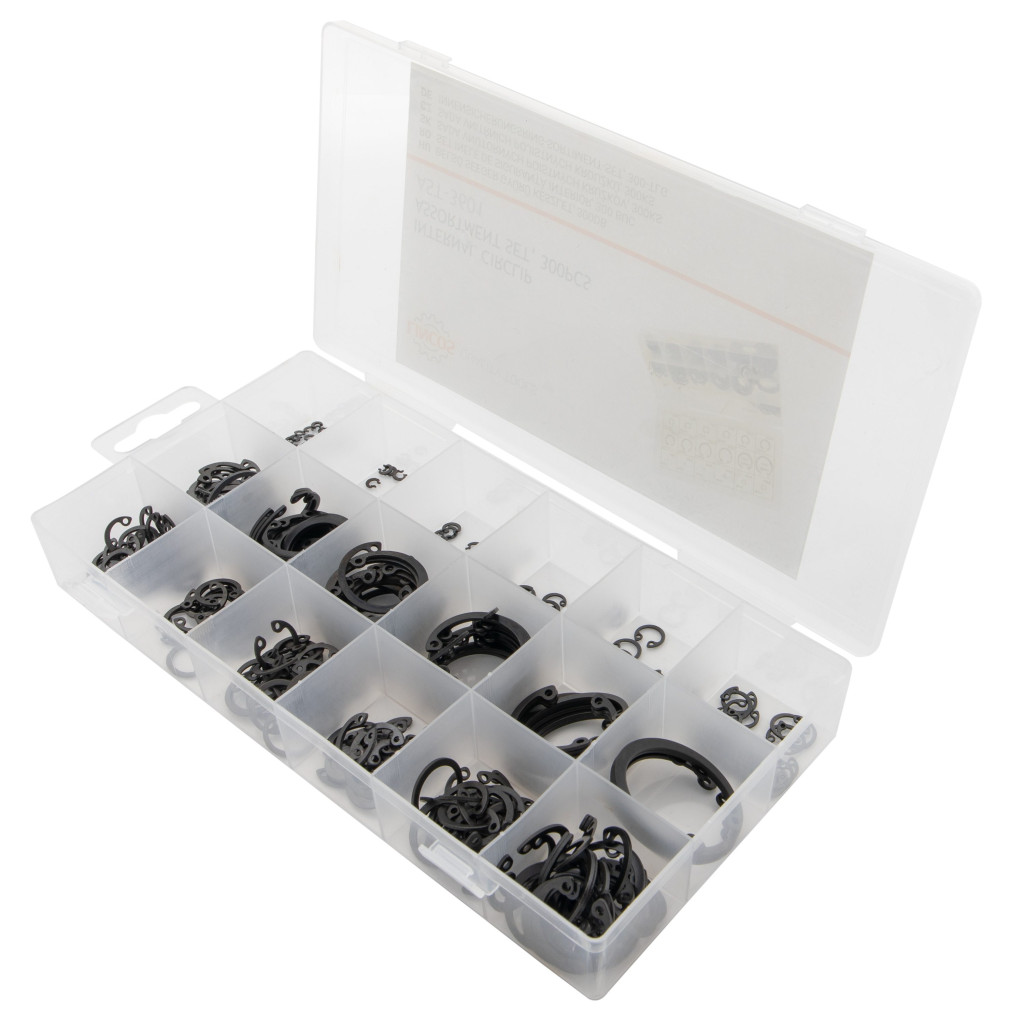Ez a 300 darabos belső Seeger gyűrű készlet tökéletes mechanikai, ipari és autószerelési alkalmazásokhoz, biztosítva az alkatrészek biztonságos és stabil rögzítését furatokban és házakban kialakított hornyokban.