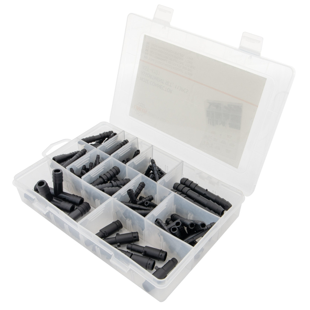 Ez a 113 darabos tömlőcsatlakozó készlet kiválóan alkalmas gumi- és műanyagcsövek biztonságos csatlakoztatására különféle alkalmazásokban. Ideális vákuumcsövekhez, üzemanyag-visszatérő vezetékekhez, hűtőfolyadék-csövekhez és egyéb alacsony nyomású folyadékáramlási rendszerekhez.