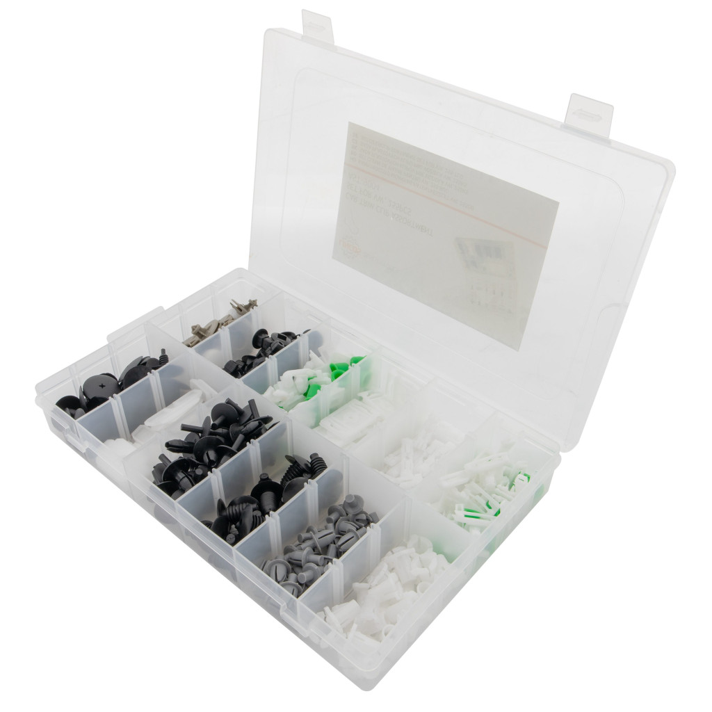 A készlet különféle rögzítőelemeket és gyorsrögzítő patentokat tartalmaz, amelyek tökéletesek autószerelési és javítási munkákhoz. A praktikus műanyag tárolódoboz megkönnyíti a rendszerezést és a gyors hozzáférést.