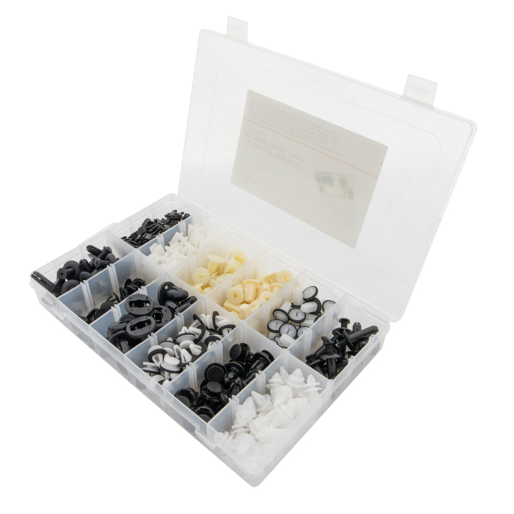 Ez a 370 darabos kárpitrögzítő patent készlet Mitsubishi modellekhez készült, biztosítva az OEM-minőségű rögzítőelemeket a karosszériaelemek, lökhárítók, ajtópanelek és belső burkolatok számára. A készlet 12 különböző típusú patentet tartalmaz, garantálva a tökéletes illeszkedést a javításokhoz és cserékhez.
