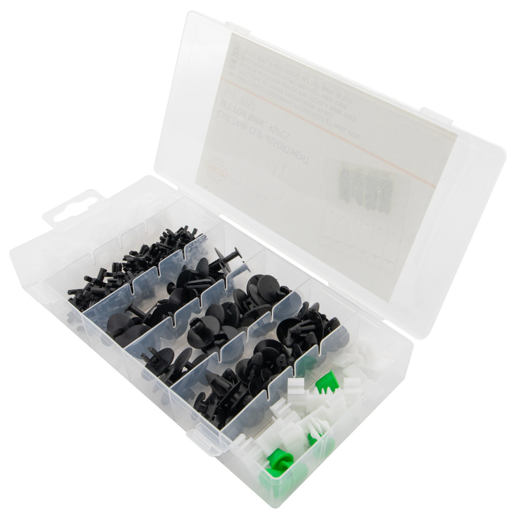 A készletben gyakran használt BMW rögzítőpatentek találhatók, így tökéletes autószerelési és javítási munkákhoz. A rendszerezett tárolódoboz megkönnyíti a használatot és a gyors hozzáférést.