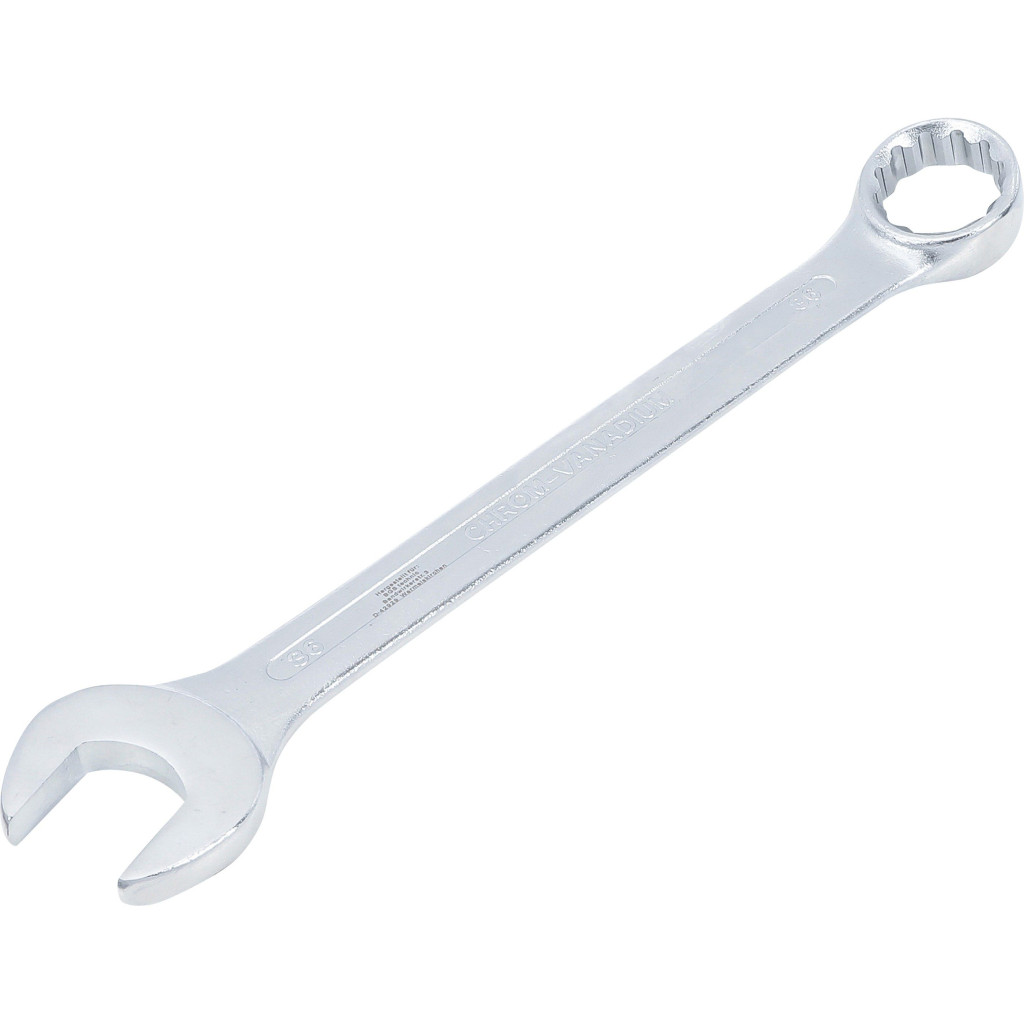 A 36 mm-es csillag-villáskulcs nagy igénybevételű, professzionális felhasználásra készült, ahol a szilárdság és nyomaték létfontosságú. Tartósságáról és pontos illeszkedéséről a hidegen kovácsolt króm-vanádium acél gondoskodik. A matt króm bevonat tükröződésmentes, korrózióálló felületet ad, tökéletes választás professzionális munkakörnyezetbe.
