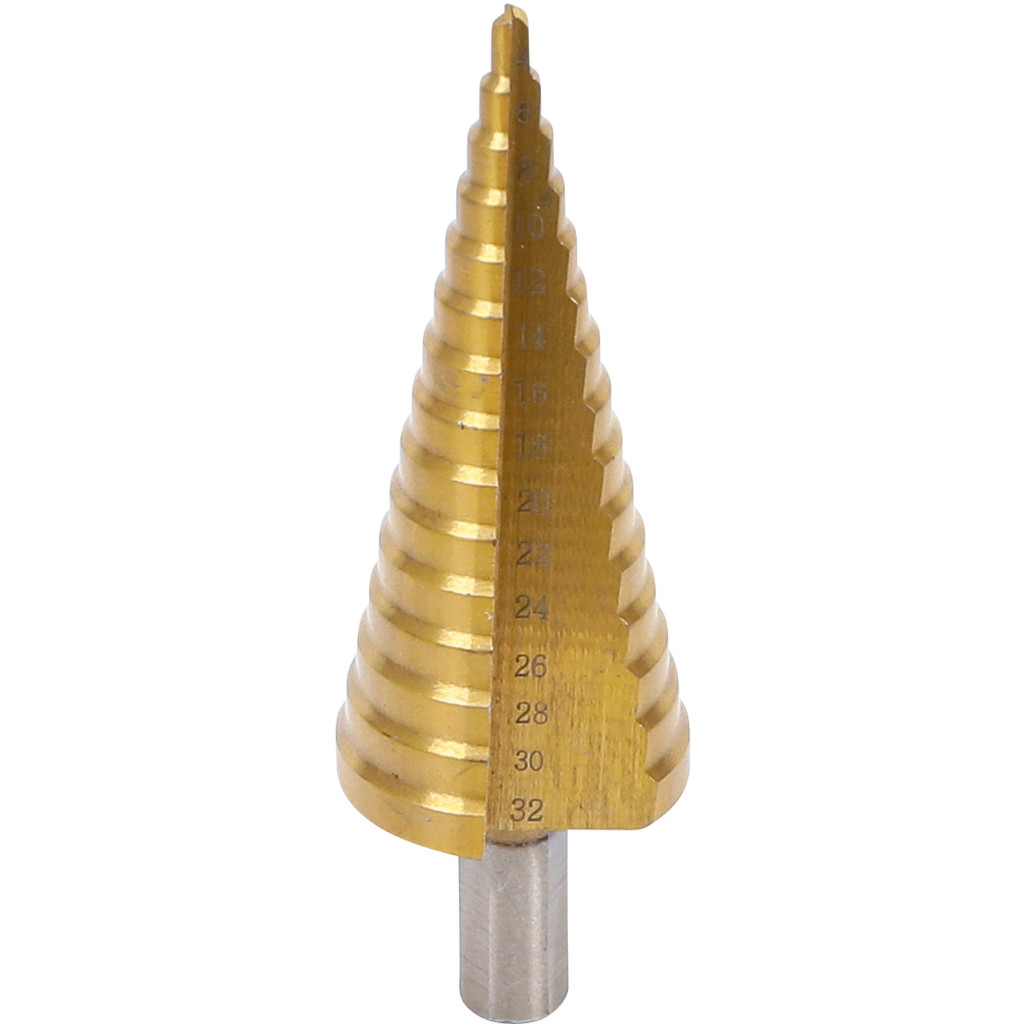 A sokoldalú fúrószár 4 mm-től 32 mm-ig, 2 mm-es lépésekben teszi lehetővé a furatok átmérőjének bővítését, így a furatmérethez nem kell szerszámot cserélni. A titán-nitrid bevonat jelentősen csökkenti a súrlódást és a hőképződést, biztosítva a hűvösebb működést és a megnövelt tartósságot.