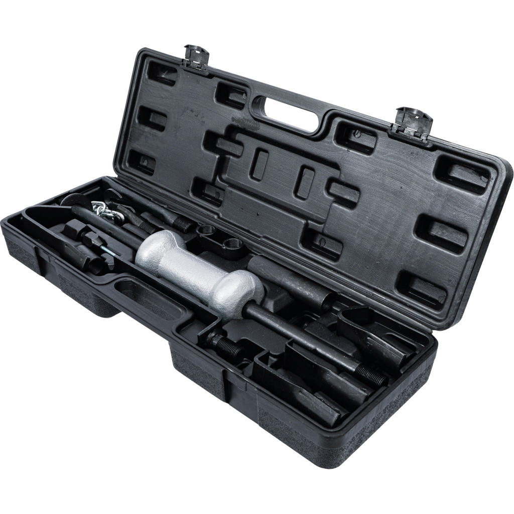 Ez a 11 darabos horpadásjavító készlet csúszókalapáccsal ideális választás karosszériaelemek javításához. A készlet egy 3 kg-os univerzális csúszókalapácsot tartalmaz, amely masszív acél szárú, 7/8" x 14 UNF menetes, a tartozékok gyors és stabil csatlakoztatásához.