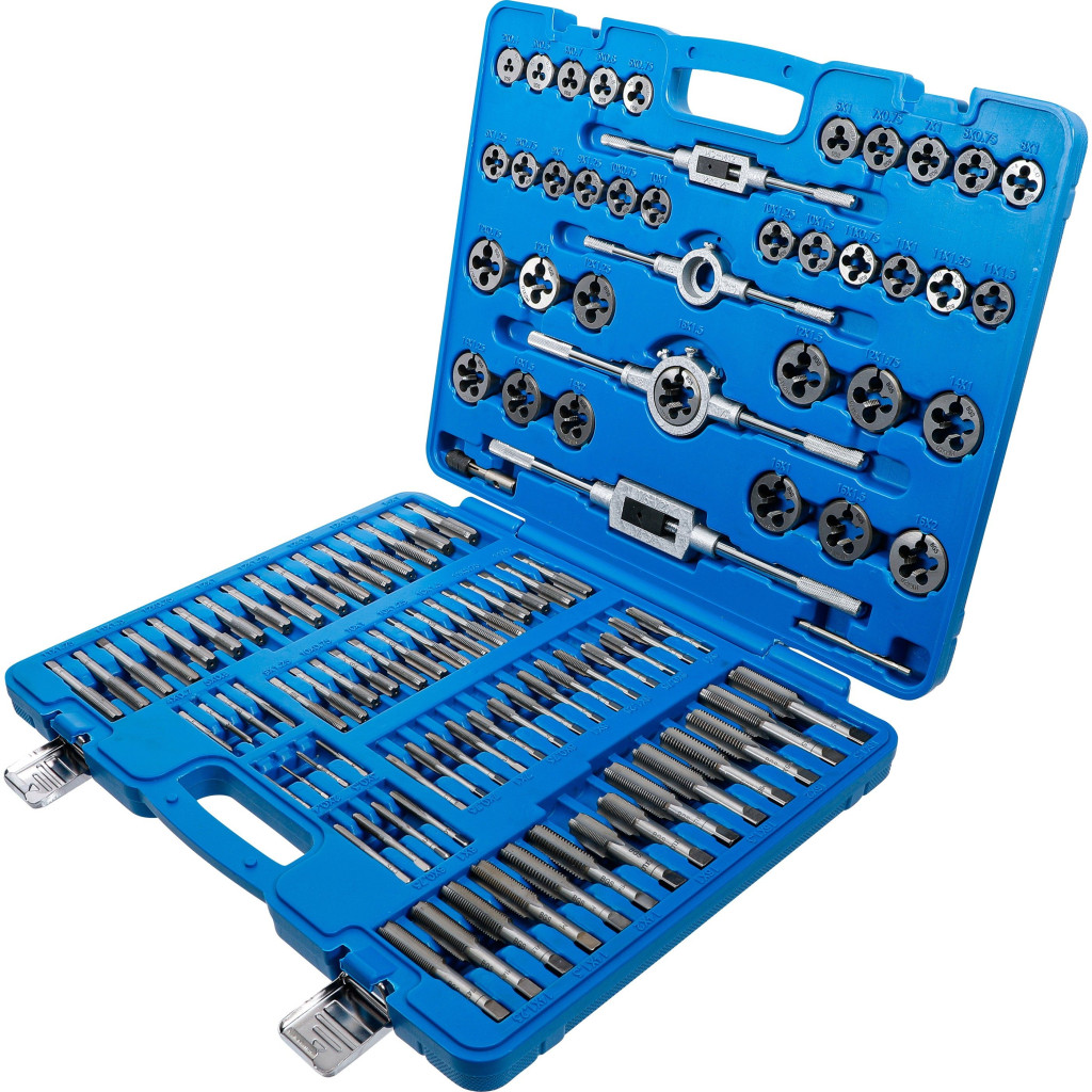 Ez az átfogó menetfúró készlet (M2–M18) 110 darabot tartalmaz, így ideális belső és külső finommenetek vágásához vagy javításához. A kifejezetten precíziós menetvágási feladatokhoz tervezett készlet menetfúrók és matricák teljes választékát tartalmazza a megfelelő tartókkal együtt, mindezt szépen becsomagolva egy tartós műanyag tokba.
