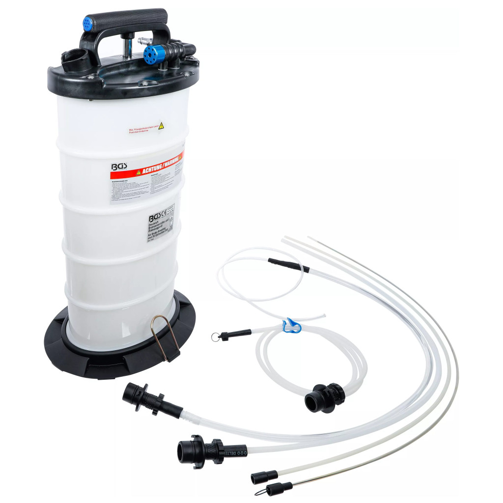 10 literes pneumatikus és kézi olajleszívó, féklégtelenítő funkcióval, nem korrozív folyadékokhoz, többféle szívótömlővel és egykezes szelepes működtetéssel.