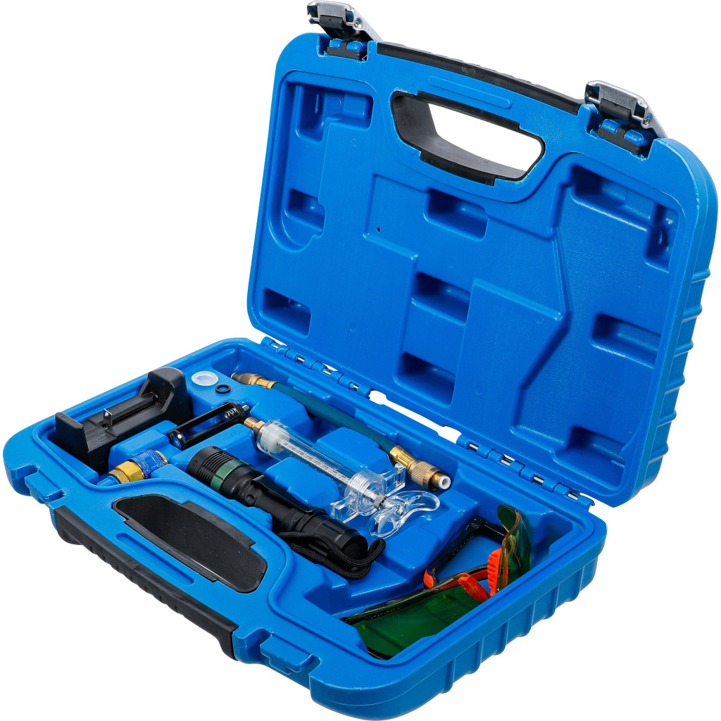 UV szivárgásvizsgáló készlet R134a hűtőközegű rendszerekhez, UV lámpával, védőszemüveggel, akkumulátorral, töltővel és csatlakozó tartozékokkal.