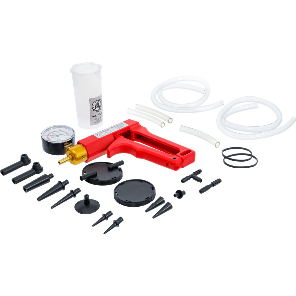 A vákuumszivattyú és féklégtelenítő készlet egy multifunkcionális, kézi működtetésű eszköz, amelyet vákuumrendszerek ellenőrzésére és hidraulikus fék- és kuplungvezetékek légtelenítésére terveztek. Ideális a MAP szenzorok, szelepek, vákuumtömlők és egyéb kapcsolódó alkatrészek működésének és tömítettségének ellenőrzésére.