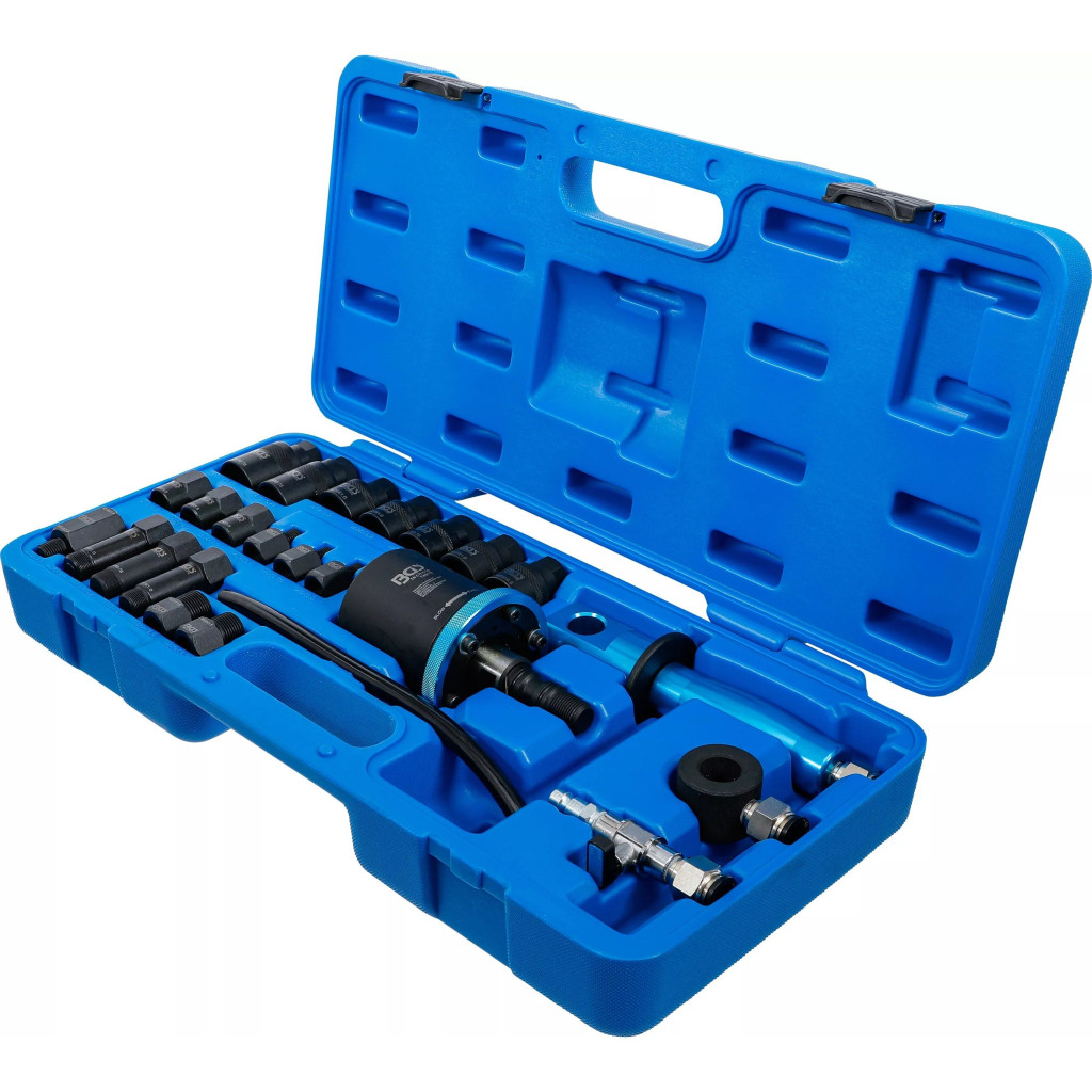 Ez a pneumatikus injektor kiszerelő készlet hatékony megoldást nyújt beszorult vagy beragadt dízel injektorok eltávolítására. A szerszám sűrített levegő segítségével nagy erejű ütést mér az injektorokra, ezáltal könnyedén fellazítja a korom és rozsda okozta beszorulásokat. Az eltávolító a mellékelt számos adapter egyikével közvetlenül az injektorba csavarható, így biztos és hatékony kiszerelést biztosít.