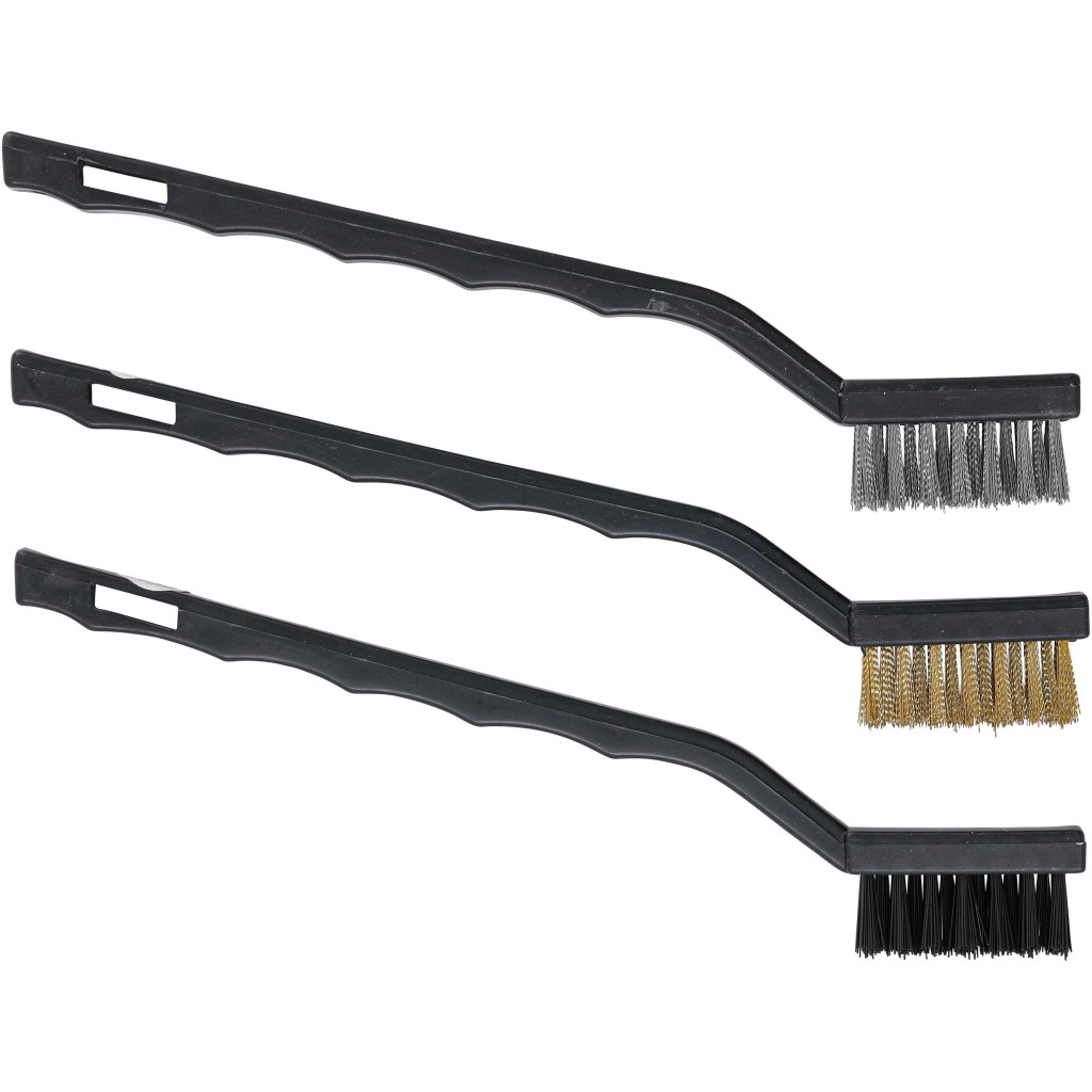 Ez a 3 darabos kefekészlet ideális különféle tisztítási és karbantartási munkákhoz, mivel különböző sörtetípusokat tartalmaz: sárgaréz, nylon és acél. Mindegyik kefe fekete műanyag nyéllel rendelkezik, ami kényelmes és biztos fogást nyújt.