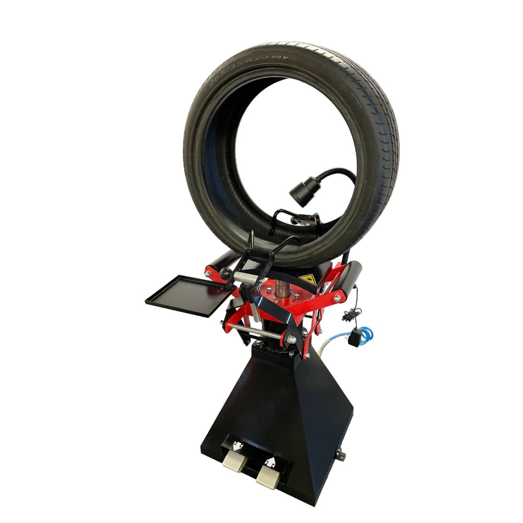 A pneumatikus feszítő egy professzionális gumijavító állomás. Lehetővé teszi a gumiabroncs szilárd rögzítését és oldalainak széttárását, így kényelmesen hozzáférhet a sérült területhez. Egyszerűen helyezze az abroncsot a görgők közé, állítsa be a terpesztőhorgokat, és aktiválja a feszítőszerkezetet. Az abroncs oldalait a beépített pneumatikus működtető fogja széthúzni. A feszítőt két pedállal szabályozzák: fel és le. Az aktuátor felfelé mozgatása széthúzza az abroncsot, míg lefelé mozgatása elengedi az abroncsot. A széthúzási tartomány a vezérlőpedálokkal fokozatmentesen állítható. A terpesztőhorgok elhelyezése az abroncs szélességéhez igazítható. A horogok négy pozícióba állíthatóak, valamint csapszeggel és anyával rögzíthetőek. A testhez rögzített, rugalmas rúdon lévő halogén lámpa biztosítja a javítási terület megfelelő megvilágítását. A lámpa 220V-os hálózati feszültséggel működik. A kényelmes szerszámpolc gondoskodik arról, hogy a szükséges szerszámok és javítási anyagok mindig kéznél legyenek. A készülék 6-8 bar üzemi nyomású sűrített levegővel működik. A feszítő gép elektromos csatlakozóaljzattal van felszerelve, amely lehetővé teszi pneumatikus szerszám (pl. csiszoló) csatlakoztatását. Levegő előkészítő rendszerrel van felszerelve (páramentesítő és olajadagoló).