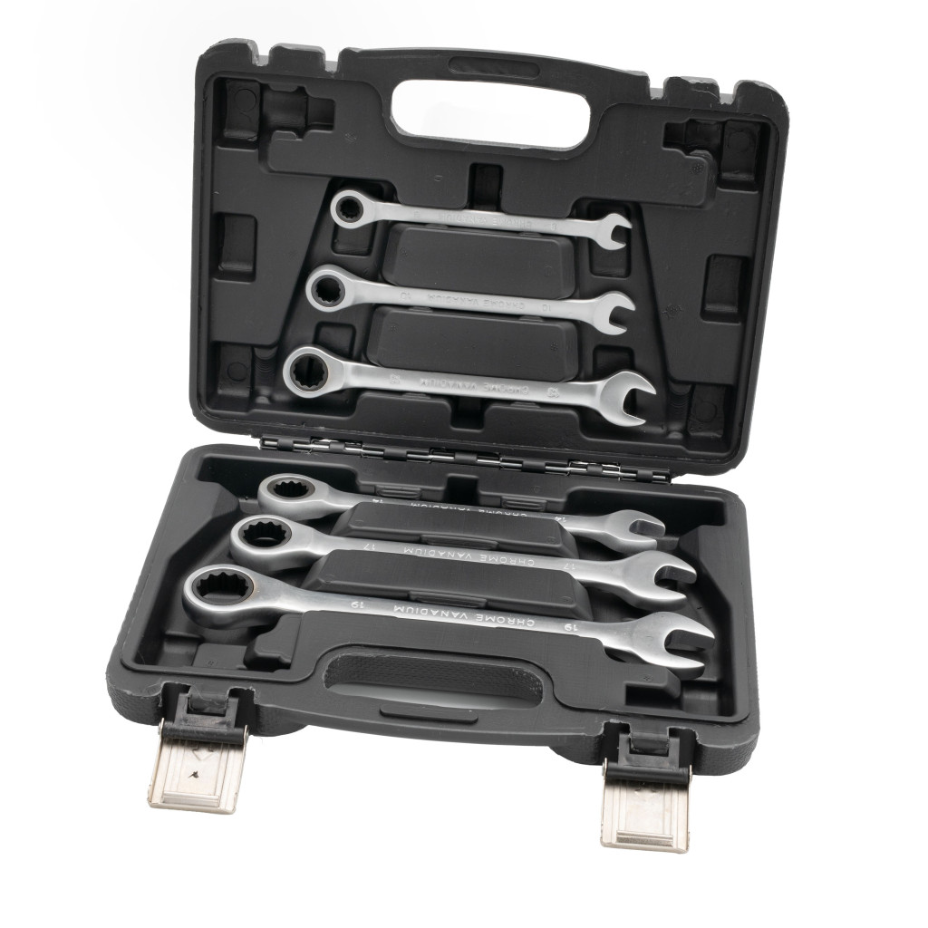 A készlet 6 db racsnis villáskulcsot tartalmaz, amelyek még a nehezen elérhető helyeken is megkönnyítik a munkát. A szerszámok tartós és ellenálló króm-vanádium acélból készültek. Biztonságosan tárolhatóak és szállíthatóak a szerszámokhoz mellékelt erős műanyag kofferban.