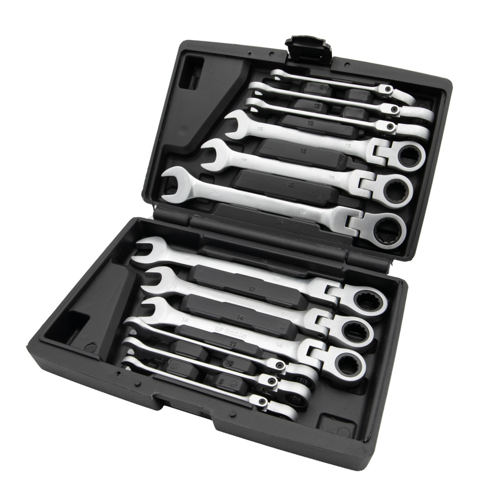 Mindegyik csavarkulcs rugalmas kialakítással rendelkezik, amely lehetővé teszi a nehezen elérhető helyekhez való könnyű hozzáférést és az akadályok megkerülését. Ez a rugalmasság növeli a manőverezhetőséget, kényelmesebbé és hatékonyabbá téve a feladatokat. A fogaskerekes mechanizmus egyenletes és folyamatos forgást biztosít, csökkentve a kulcs áthelyezésének szükségességét használat közben.