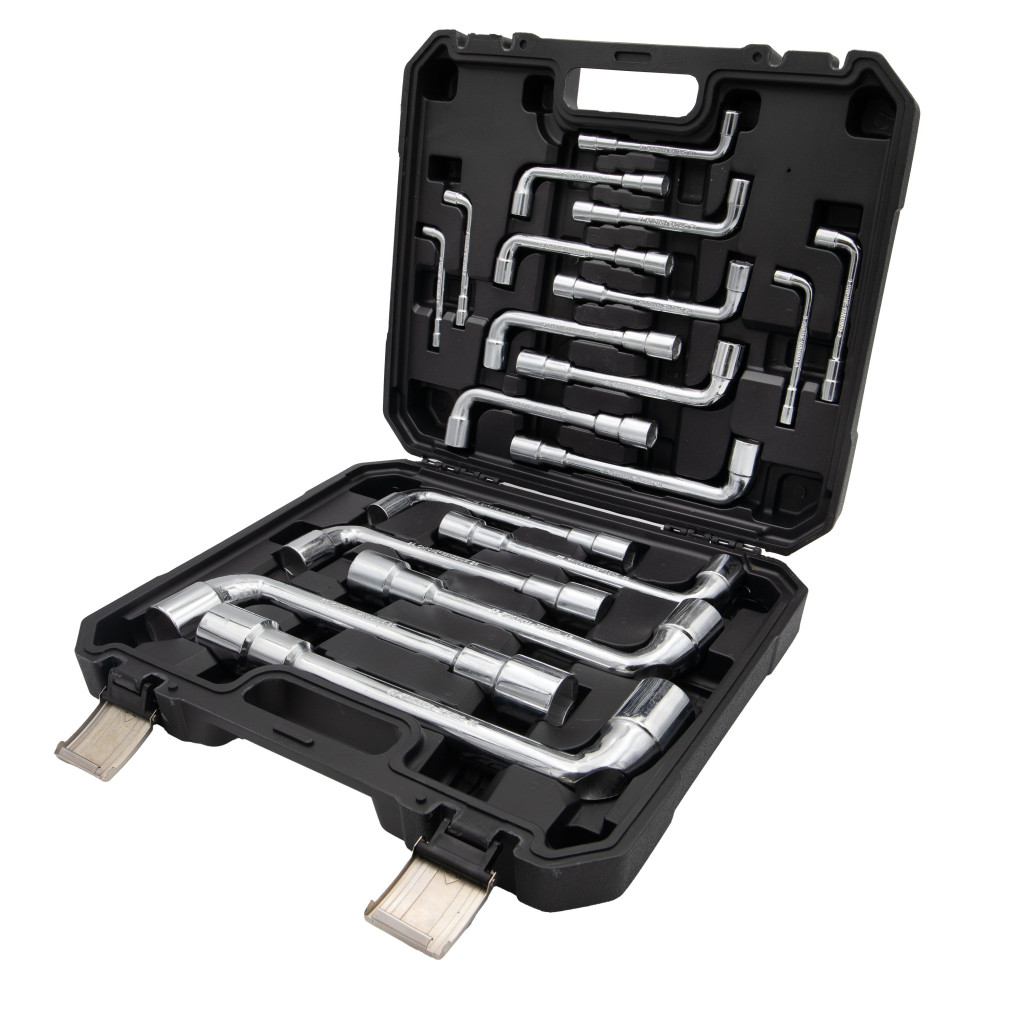 Mindegyik villáskulcs L-alakú kialakítással rendelkezik, amely lehetővé teszi a könnyű hozzáférést a kötőelemekhez szűk helyeken vagy korlátozott távolságú területeken. Az L-alak erőt és nyomatékot biztosít, megkönnyítve a csavarok és anyák hatékony meghúzását vagy lazítását.