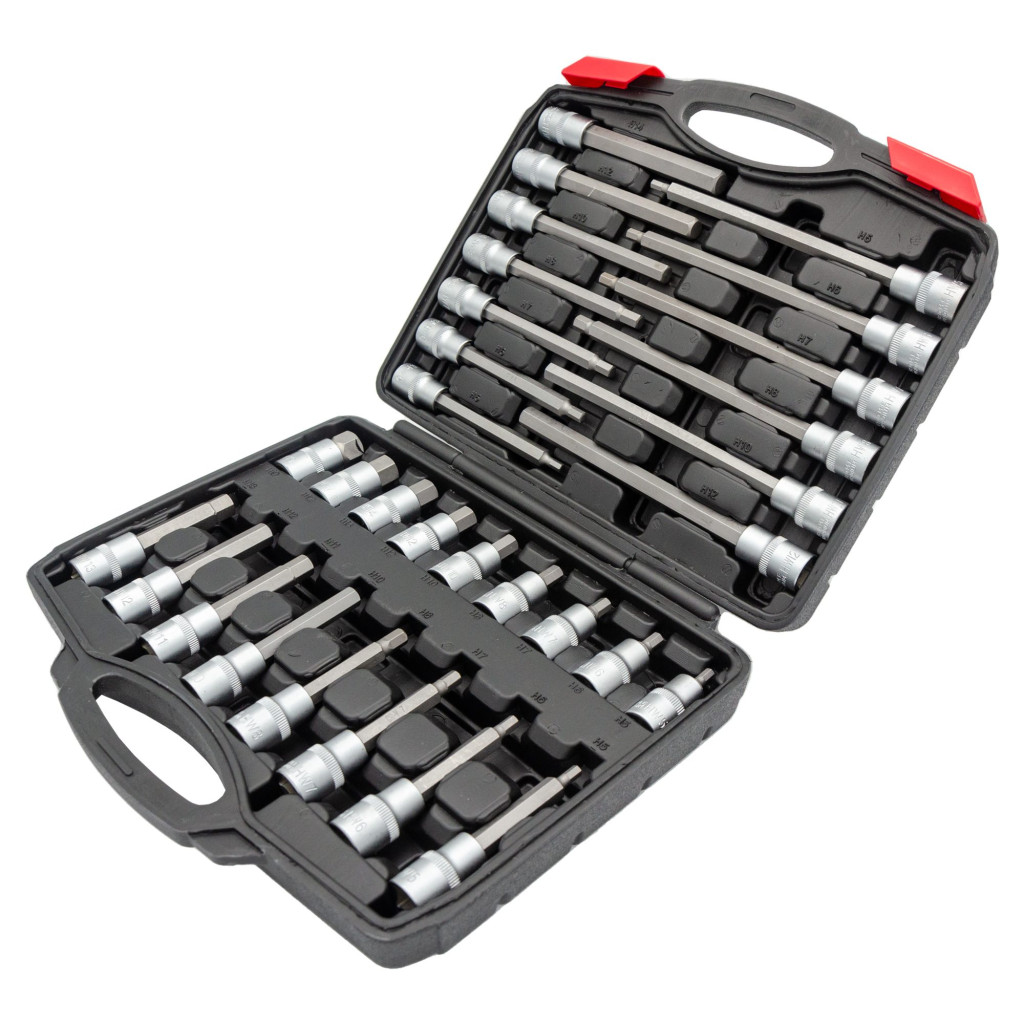 Az extra hosszú biteket úgy tervezték, hogy olyan szűk területeket is elérjenek, amelyeket a hagyományos bitek nem érnek el, a lesarkított végek pedig biztonságos rögzítést tesznek lehetővé a csavarkulcsokhoz a csúszásmentes fogás érdekében. A kényelem kedvéért kofferban kapható.