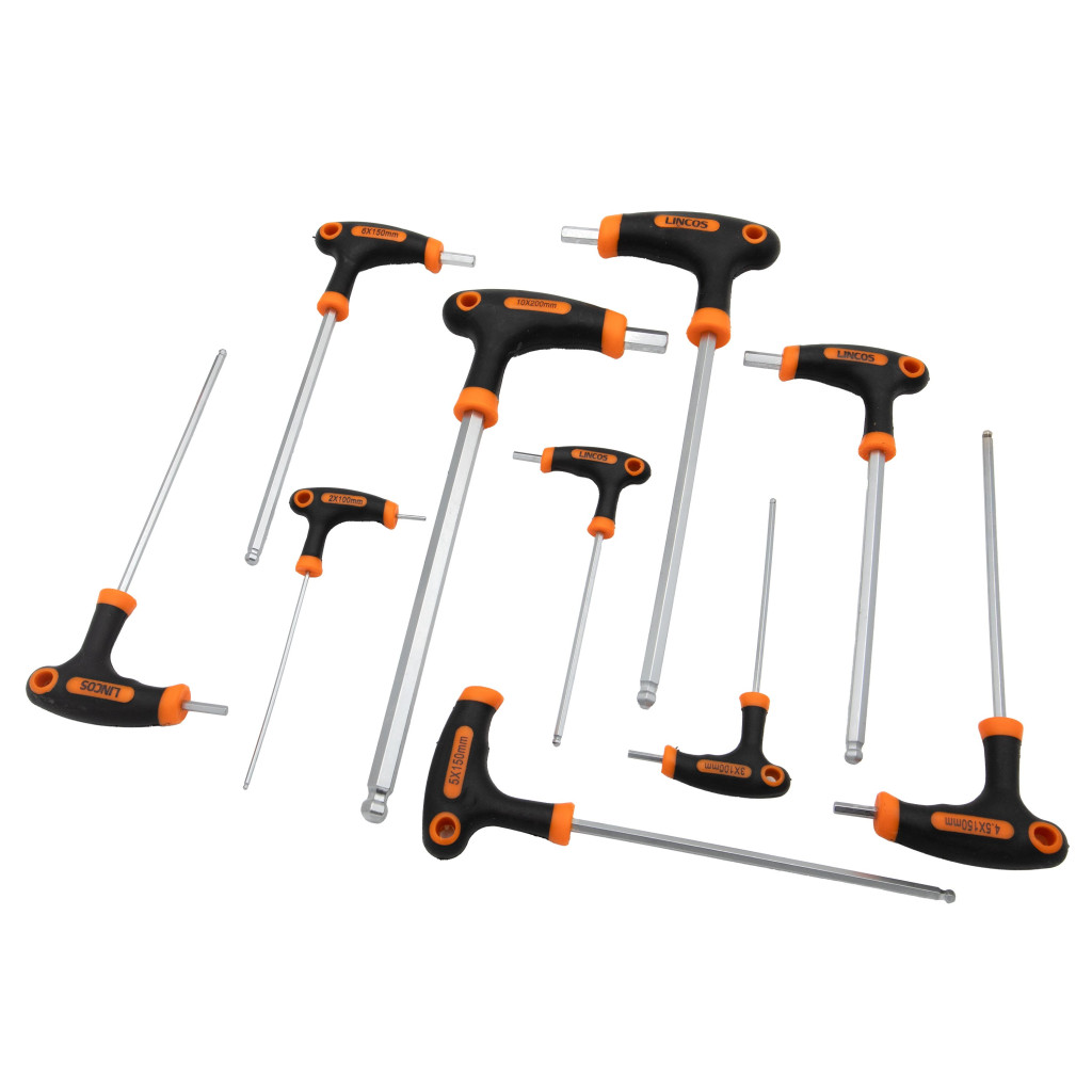 Mindegyik imbuszkulcs T-alakú fogantyúval rendelkezik, gömbvégű kialakítással. A gömbvég lehetővé teszi a könnyű hozzáférést a hatlapfejű csavarokhoz akár 25 fokos szögben is, így kényelmesen lehet dolgozni szűk helyeken vagy korlátozott távolságú területeken.