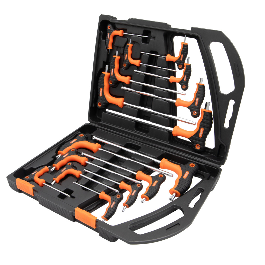 Ezenkívül a készlet T alakú Torx kulcsokat tartalmaz a következő méretekkel: T10x75mm, T15x75mm, T20x100mm, T25x100mm, T30x150mm, T40x150mm, T45x200mm és T50x200mm. Ezeket a Torx kulcsokat kifejezetten az autóipari és gépipari alkalmazásokban gyakran előforduló Torx csavarokhoz tervezték.