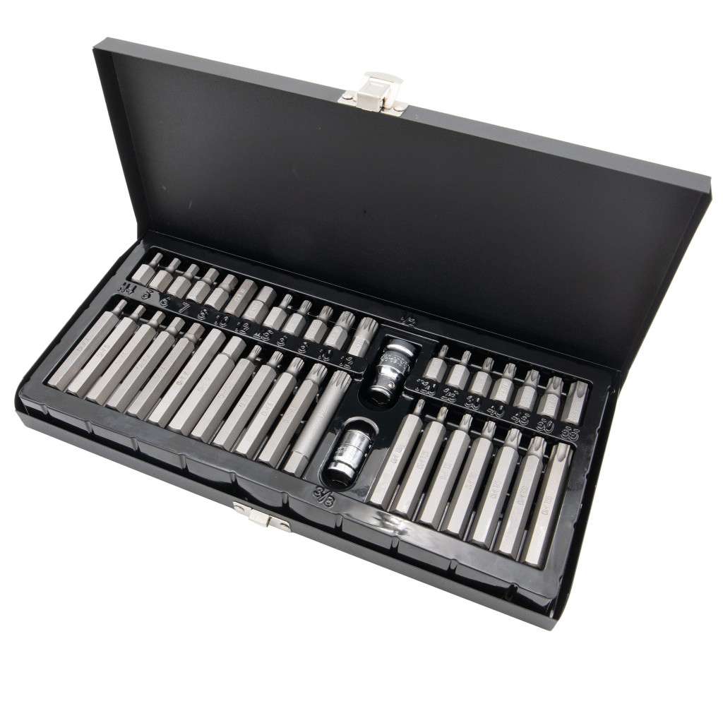 Bitkészlet, 41 darabos, fém dobozban, 30 és 75 mm hosszú bitek. Fém tároló doboz a könnyű hordozás érdekében.