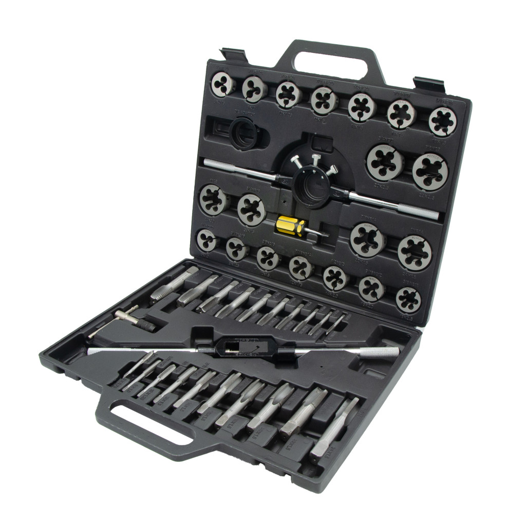 Teljes készlet külső és belső menetvágáshoz. Volfrám-karbidból készült, titán bevonattal. Alkalmas ötvözetlen és gyengén ötvözött acélokhoz 900 N/mm² szilárdságig, temperöntvényhez és színesfémekhez. Minden szerszámot rendezetten lehet tárolni a hordozható szerszámos kofferban.