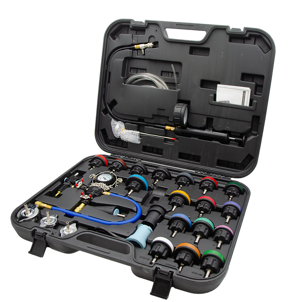 - A készlet 27 berendezést tartalmaz, köztük 22 különböző sapkát, vákuum pumpát, nyomás mérőt , kúpos adaptert, légtelenítő és hűtőfolyadék tömlőket