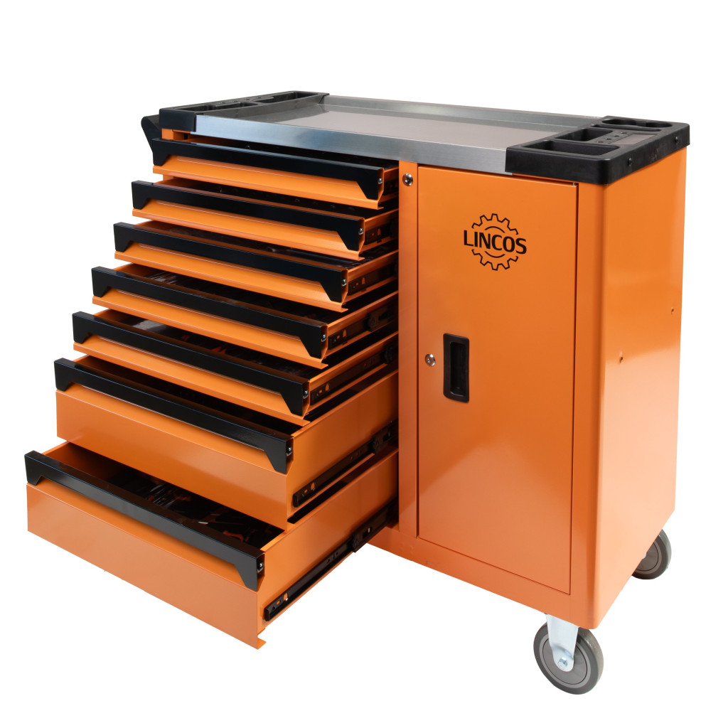 Nagy kapacitásával és 7 tágas fiókjával ez a szerszámos szekrény bőséges tárolóhelyet kínál a szerszámok és felszerelések széles skálájának. Függetlenül attól, hogy csavarkulcsokat, csavarhúzókat, foglalatokat vagy egyéb szerszámokat kell tárolnia. A robusztus felépítés biztosítja a tartósságot és a hosszú élettartamot, így megbízható választás személyes és professzionális használatra egyaránt. Minden fiók átgondolt kialakítású, simán csúszó csúszdákkal rendelkezik, így könnyedén hozzáférhet szerszámaihoz.