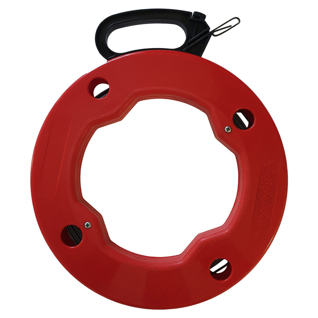 30m-es acél kábelbehúzó műanyag piros tokban. Lapos fém-szalag, mérete 3x1mm. Behúzófej mérete 40x10x3mm.