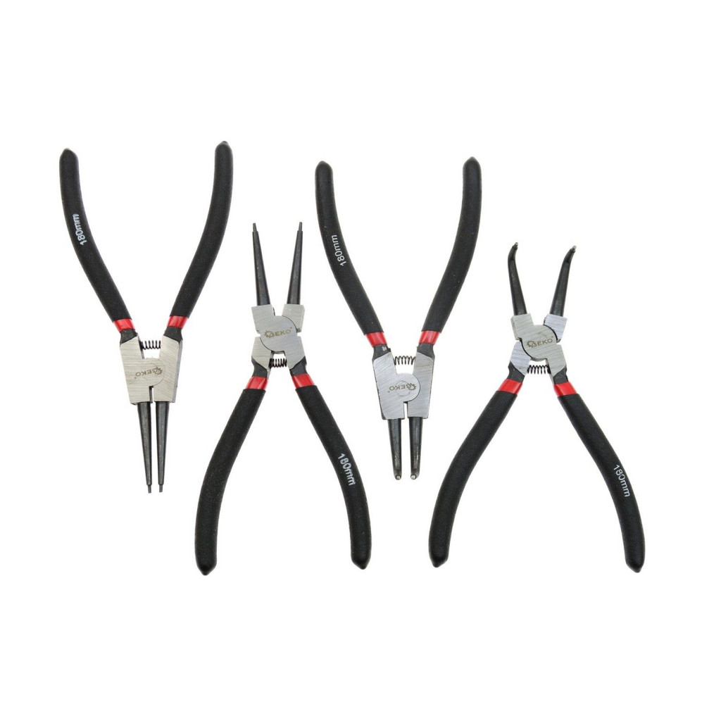 A 7"-es (180mm hosszú) seeger fogó készlet egyenes és ferde hegyű fogókat tartalmaz belső és külső biztosító gyűrűkhöz.