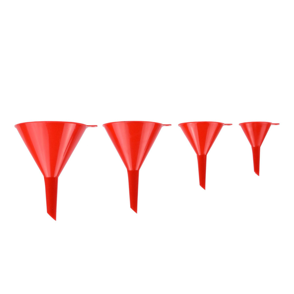 Univerzális tölcsérek 4 különböző méretben. Kiválóan alkalmas műhelybe, kertbe, konyhába. Nélkülözhetetlen különböző típusú folyadékok utántöltésénél gépjárművekben, valamint a kertben, permetezőgépek feltöltésekor stb.