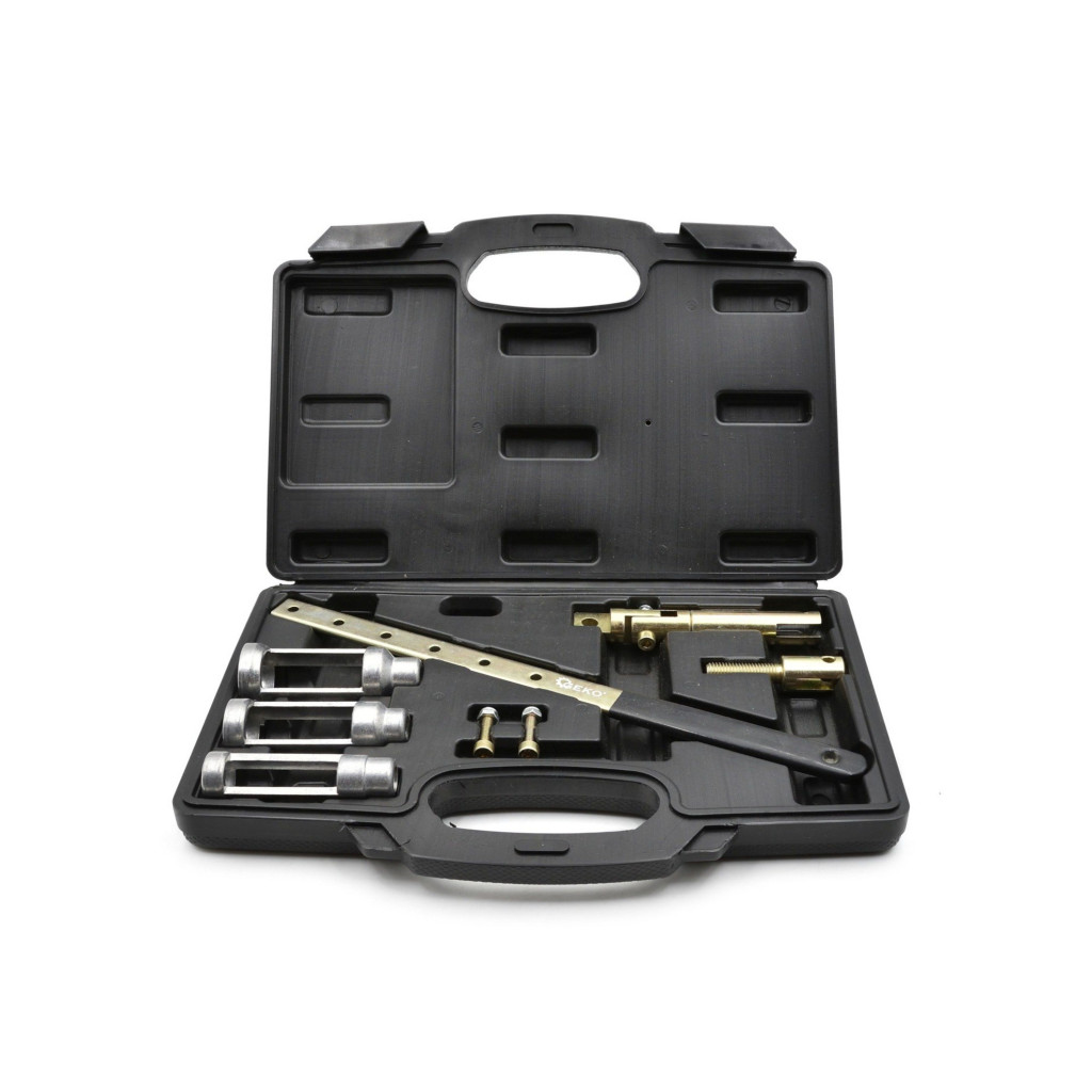 Készlet amelyet a szeleprugók összenyomására és eltávolítására terveztek 8V,12V,16V,24V OHV, OHC és CVH motorokhoz. A csomagban három különböző rugók eltávolítására szolgáló adapter található. Biztosítja a gyors szétszerelést és a könnyű használatot. Kiváló minőségű acélból készült. Praktikus műanyag tokban érkezik.