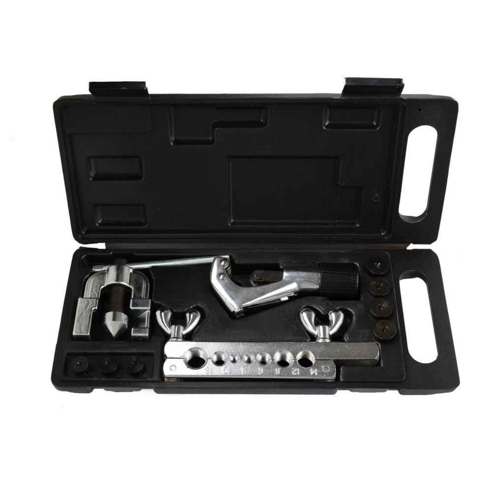 Cső peremező szerszámkészlet csővágóval. Csőméretekhez: 5, 6, 8, 10, 12, 14, 18mm. Réz-, alumínium-, magnézium- és sárgaréz csövek, valamint puha acél (max. 1 mm vastag) csövek peremezésére tervezték. Alkalmas járművekhez, HVAC, hűtés, fűtés szerelési munkákhoz.