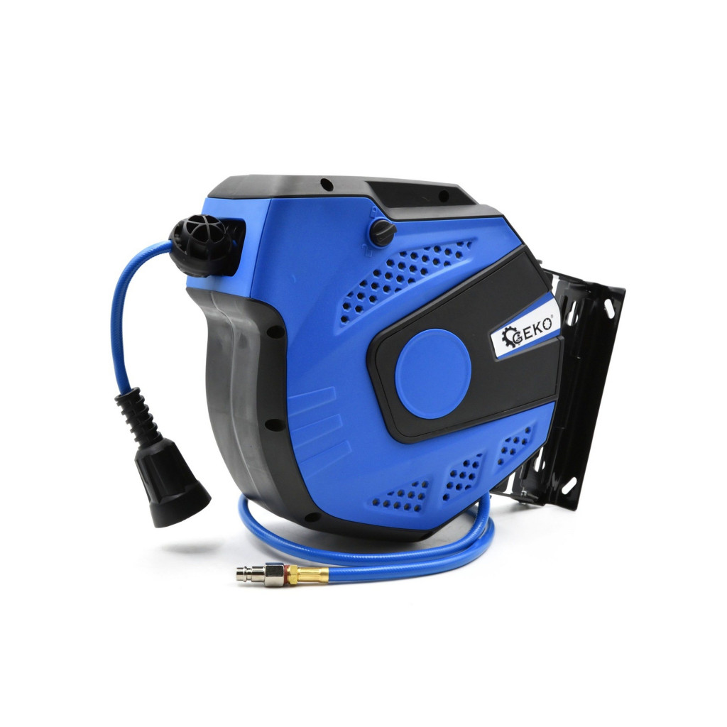 A pneumatikus tömlő kiváló minőségű megerősített PVC anyagból készült. Magas nyomásállóságú. Az orsó automata blokkolóval van felszerelve, amely megakadályozza, hogy a tömlő teljesen felcsévélje magát, valamint egy akasztóval, amely lehetővé teszi a tömlő falra akasztását.