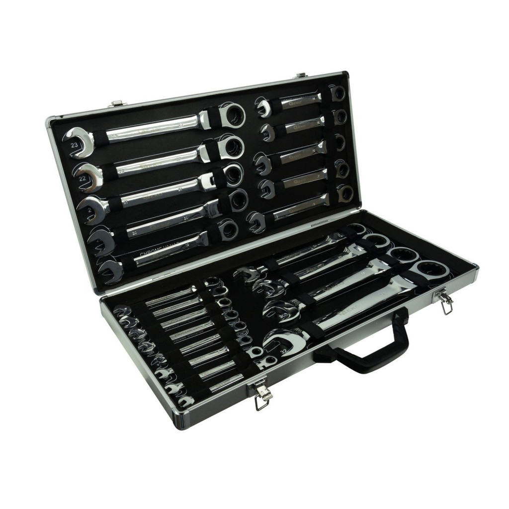 22db-os csuklós racsnis csillag-villáskulcs készlet 6-32mm. A 12 pontos racsnis vég akár min. 5°-os elfordítással is hatékony. Méretek: 6, 7, 8, 9, 10, 11, 12, 13, 14, 15, 16, 17, 18, 19, 20, 21, 22, 23, 24, 27, 30, 32 mm.