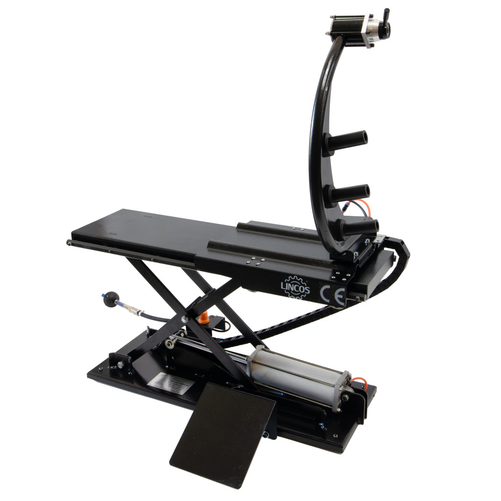 Pneumatikus működésű, padlóra szerelhető kerékemelő centírozó géphez. Teherbírás: 80kg. Emelőasztal min. magasság 130mm, max. magassága 420mm.