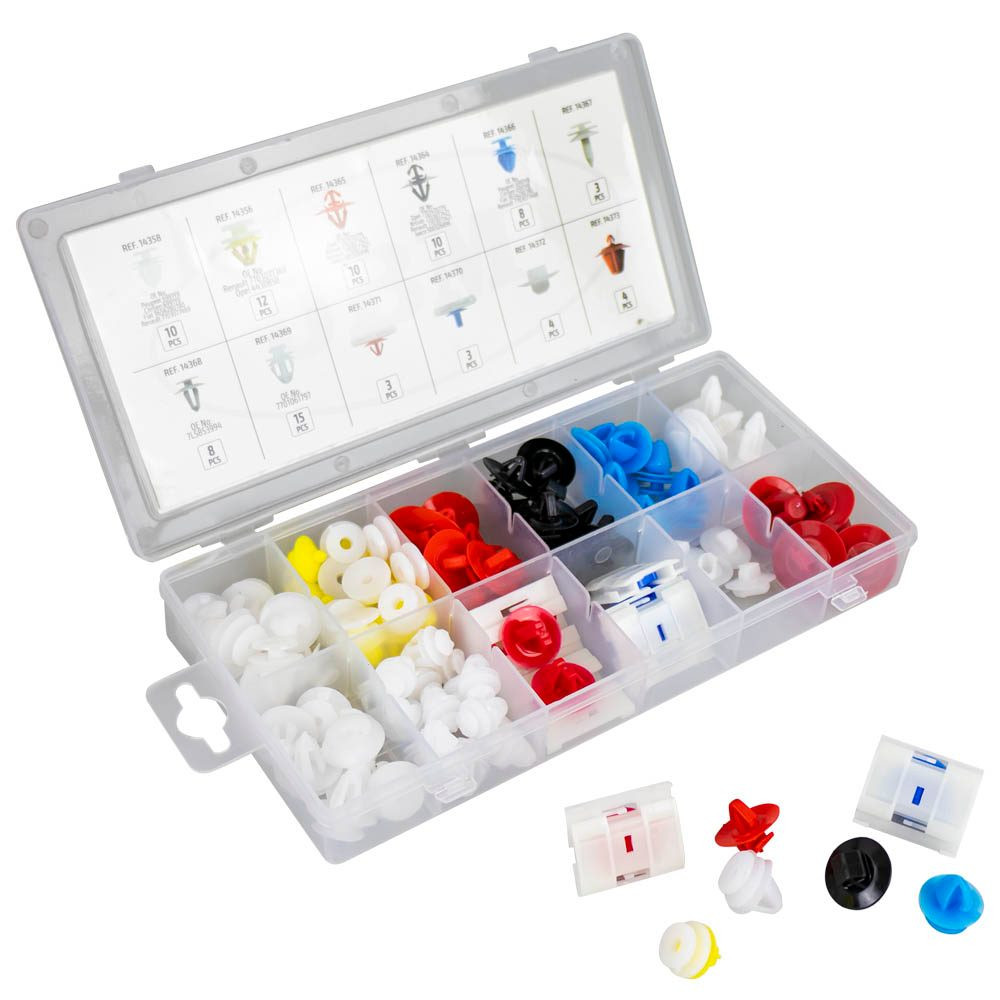 A rögzítőkapcsok kiváló minőségű műanyag nylon anyagból készülnek, amely erős, könnyű, kopásálló és nem károsítja a díszlécek felületét. 12 különböző stílusú műanyag patent az összes lehetséges igény kielégítésére. Széles körben használják dekorációs panelekhez, ajtó panelekhez, lökhárítókhoz, ajtó díszlécekhez, sárvédőkhöz, motorháztető elemekhez stb. Alkalmazható háztartási bútorok és elektromos alkatrészek esetében is. Átlátszó műanyag tárolódobozban van, külön rekeszekkel minden típusú patentnak.