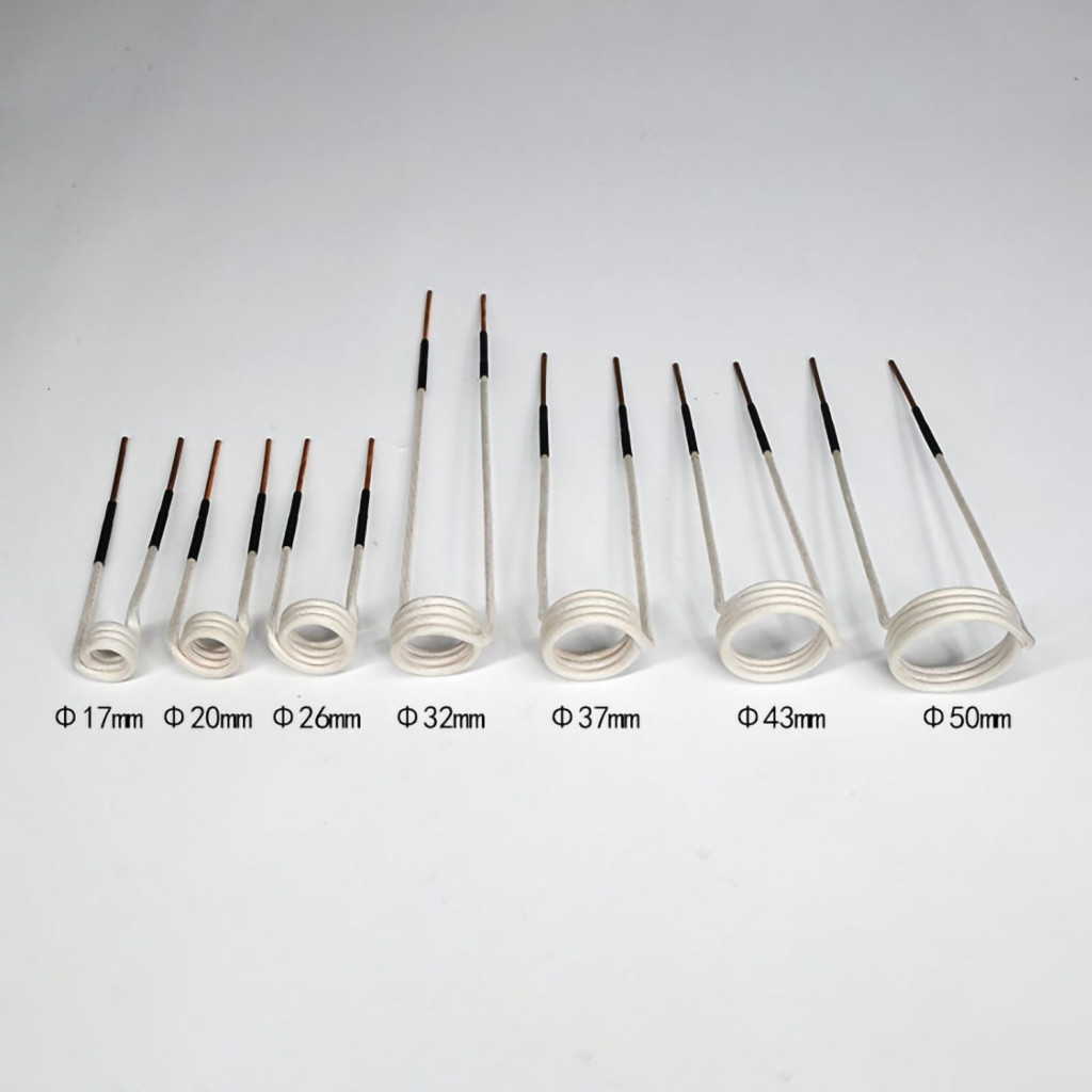Egy merőleges spirális tekercs készlet indukciós hevítőkhöz. Csavarok, csavaranyák, csapágyak stb. melegítéséhez, csövek és rudak hajlításához vagy beszorult csavarok és csövek kicsavarásához.