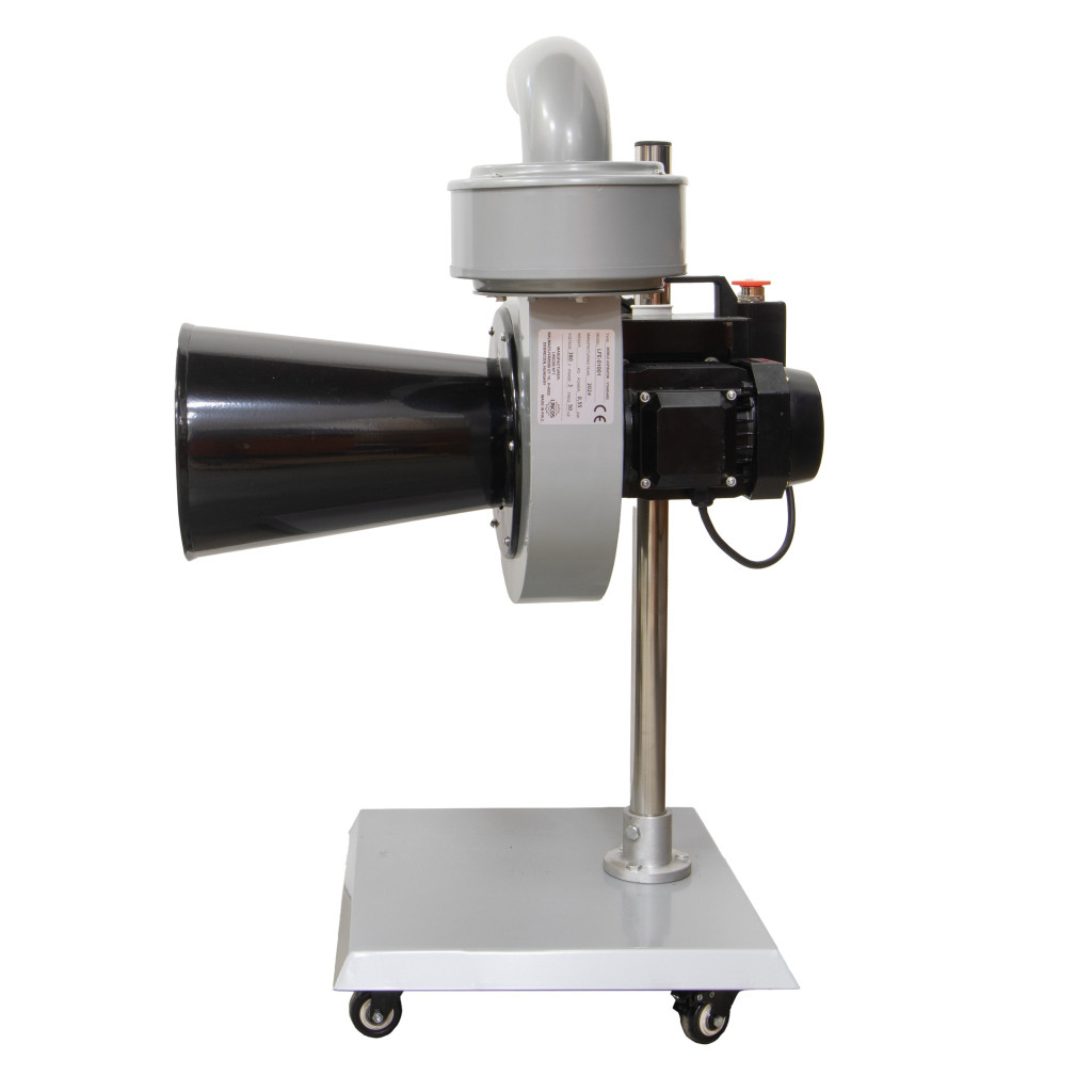 Az egység 10 méter hosszú, 76 mm-es neoprén kipufogótömlővel szerelhető, amely egy robusztus, csavarozható fém fúvókához csatlakozik, 200 mm-es beömlőnyílással, amely tökéletesen alkalmas a járművek kipufogócsövéiből származó füstök felszívására. A fúvóka magassága könnyen állítható 260 mm és 750 mm között egy kényelmes kézzel állítható forgótárcsával, ami lehetővé teszi a pontos beállítást a jármű különböző kipufogómagasságaihoz.