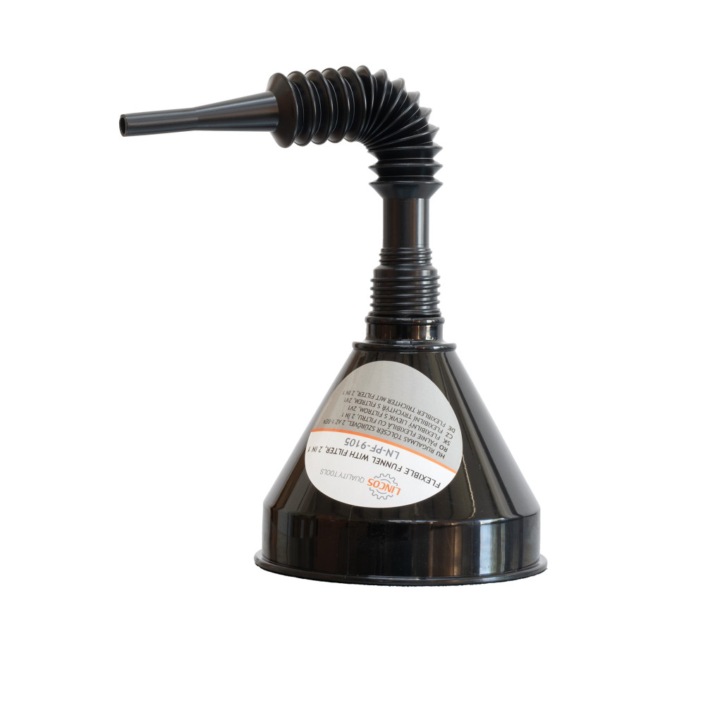 A flexibilis nyakú tölcsér a szerelők rendkívül praktikus eszköze, amely hálós szita segítségével szűri ki a nem kívánt részecskéket, és segíti az olaj és egyéb folyadékok pontos és tiszta öntését. A készülék tartalmaz egy rugalmas csövet, amely lehetővé teszi a nehezen elérhető helyekre való könnyű hozzáférést, így nagyon kényelmes és hatékony módja pl. az olajcsere folyamatának. A készülék kialakítása és anyaga biztosítja a tartósságot és a könnyű tisztítást.