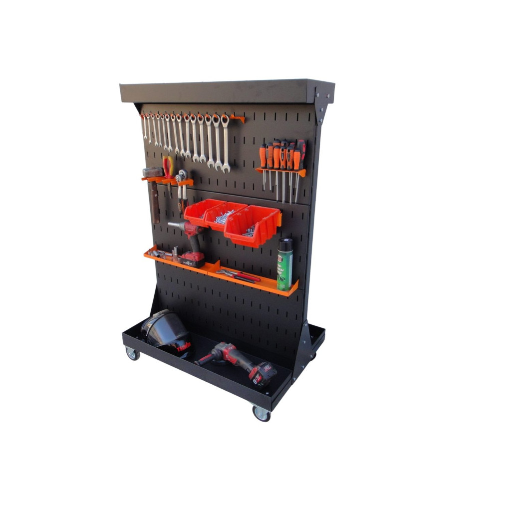 Gurulós szerszámtartó fal 3 polccal. Alkalmazható szervizekben vagy barkácsműhelyekben. Kétoldalas perforált szerszámtartó fal 950X1200mm. Különböző kiegészítők elérhetők rendelésre.