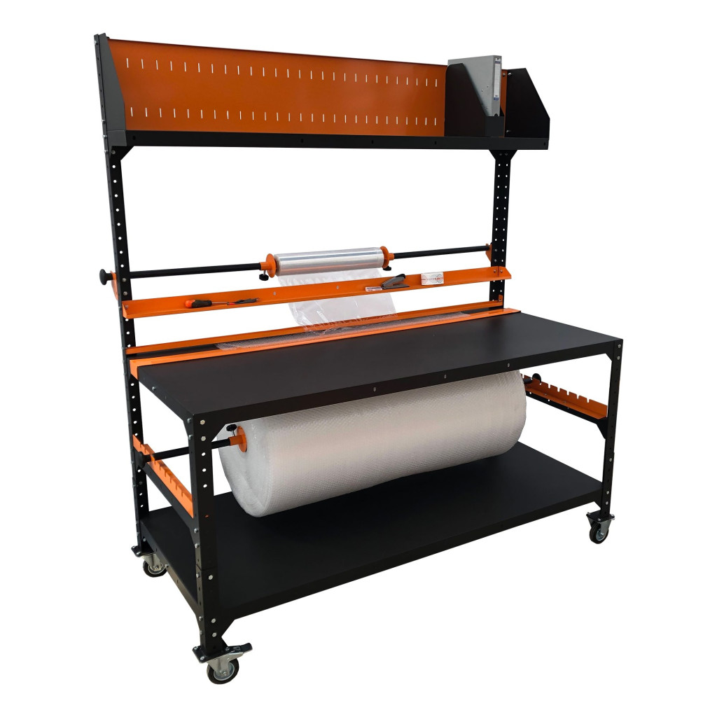 Mobil csomagolóasztal állítható magasságú alsó és felső polcokkal. Segít az áru gyorsabb és könnyebb csomagolásában.