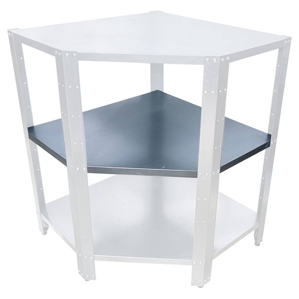 Horganyzott felületű sarok polclap fém polcállványhoz, méret: 77.5x77.5x42cm, terhelhetőség 50kg. Műhelybe, irodába, garázsba, pincébe, kamrába.