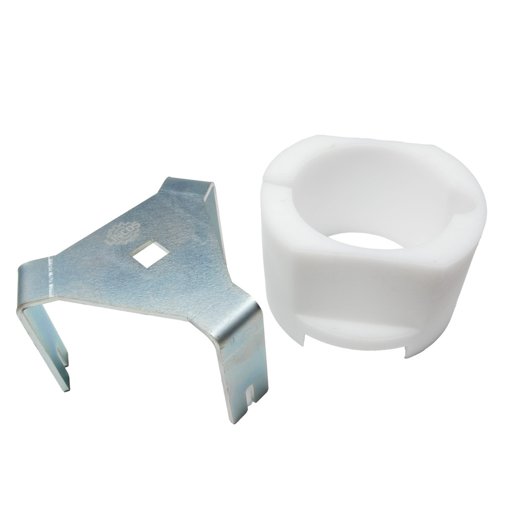 A műanyag tartó a szabványos satuba illeszkedik, a fém kulcsfogantyúk pedig eltávolítják a szűrőt a házból.