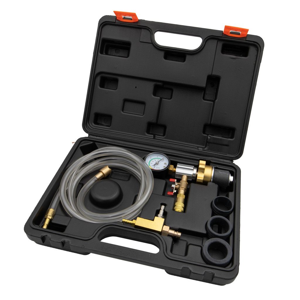 A készlet tartalmaz minden olyan fontos elemet, amely szükséges ahhoz, hogy a jármű hűtőrendszeréhez csatlakozni tudjon (pl. vákumszivattyú, tömlők, adapterek). A vákuum létrehozása után a rendszert újratöltheti hűtőfolyadékkal a megfelelő szintig.