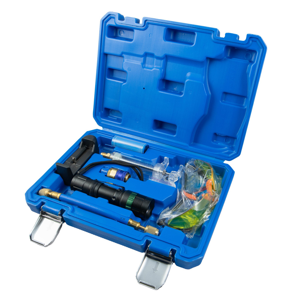 A klíma nagy segítséget nyújt átvészelni a nyári forró napokat legyen szó gépjárműben, irodában vagy az otthonunkban eltöltött órákról. Mint minden berendezést, így a klímákat is időnként karban kell tartani, kitisztítani és fertőtleníteni kell őket. Az autóklíma rendszer egy zárt rendszer, így szinte biztos, hogy csak idő kérdése és a gáz elszökik valahol. A szivárgás leggyakrabban csatlakozásoknál, kompresszornál és a hűtőnél fordul elő. A klímahűtőt az autóhasználat közben sokszor apró kavicsok érik, amelyek megsérthetik. Elég egy apró lyuk rajta ahhoz, hogy a gáz akár egy hét alatt elszivárogjon. A rendszer folytonos töltése nem jelent erre megoldást, csak állandó költséggel terheljük pénztárcánkat. Fontos ezeknek a helyeknek a felkutatása és kijavítása. Erre a feladatra tökéletesen megfelel ez a szett, amely tartalmazza a feladat elvégzéséhez szükséges valamennyi eszközt. Alkalmazása láthatóvá, könnyen észrevehetővé teszi a szivárgást, amely az eszköz használata nélkül nagyon nehézkes feladat lenne. A titka abban rejlik, hogy fluoreszkáló adalékot juttatunk a rendszerbe és a UV led-lámpa segítségével a rendszert teljesen átvilágítjuk. Ahol szivárgás van, ott világos zöld fény jelzi ezt számunkra, így akár a legkisebb lyuk is megtalálható, amelyen keresztül lehet csak hetek alatt illan el a gáz. A védőszemüveg segít megvédeni a szemünket, illetve kiemelni a szivárgást, használatával könnyebben észrevehető a szivárgás. A szettben 3W-os UV lámpa van, amely 100 lumen látható fény kibocsájtására képes. A működését 2200mAh akkumulátor biztosítja, melyet a saját AC töltőjével tudunk tölteni. A fluoreszkáló adalékot a szettben található csatlakozók és adagolók segítségével kell a rendszerhez adni az alacsony nyomás oldalon. A vizsgálat otthon is elvégezhető, nem kell autóklíma szervízbe menni miatta. Használható motorokhoz és váltókhoz egyaránt.
