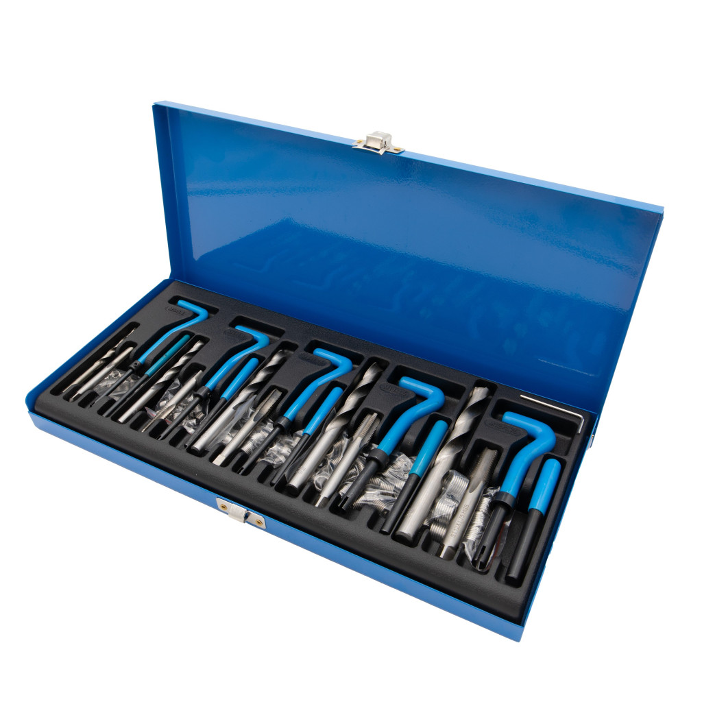 Menetjavító eszközök: Minden mérethez tartozik egy-egy menetjavító, fúrószár és behajtó, ami lehetővé teszi a menetek egyszerű és hatékony felújítását vagy javítását.