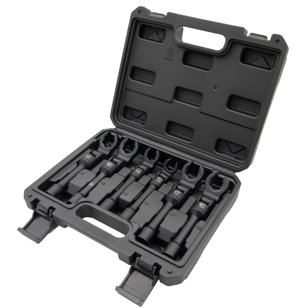 Tartós, csuklós fejű csőkulcs készlet (12-19 mm) diesel befecskendezőkhöz, üzemanyagcsövekhez és hidraulikához, 220°-os mozgástartománnyal és hosszú nyéllel nehezen elérhető helyekhez.